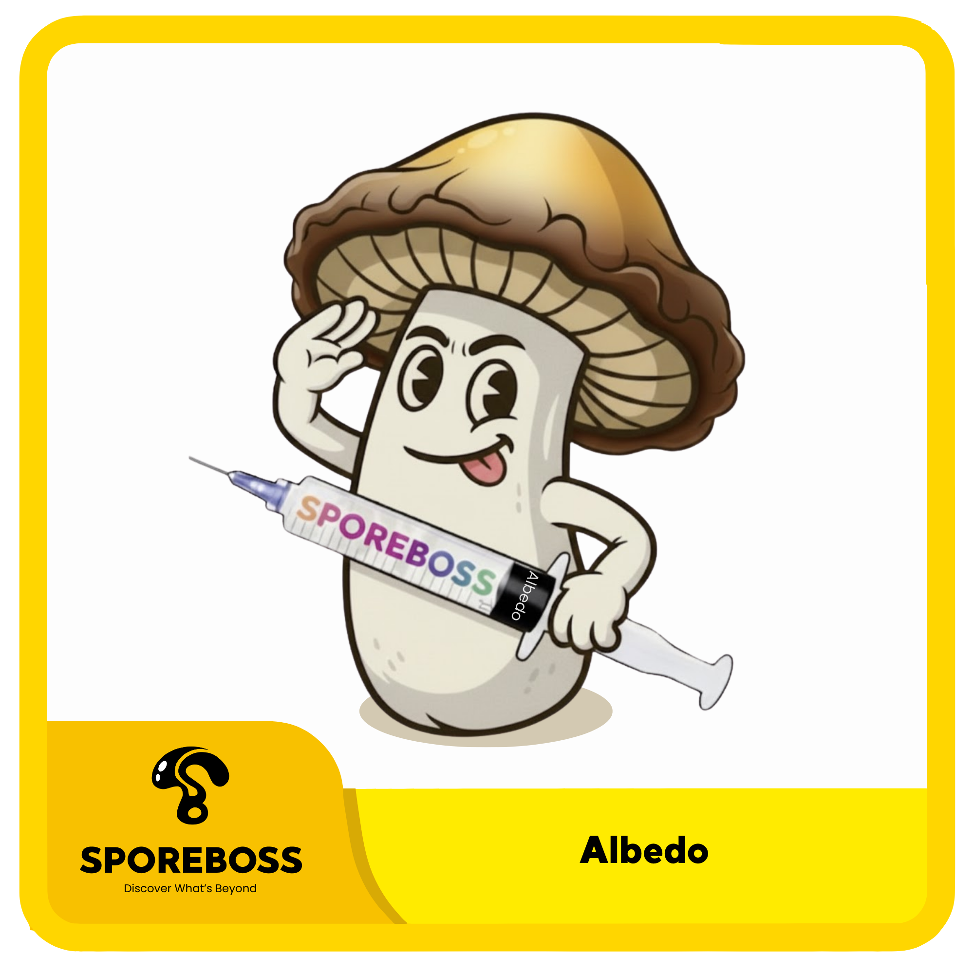 Albedo cubensis is a hybrid of Jedi Mind F*ck x Tidal Wave. Crossed and stabilized by Denver Spore Company. Albedo has thick white stipes topped with caps which are dark at the edges and gold in the center.