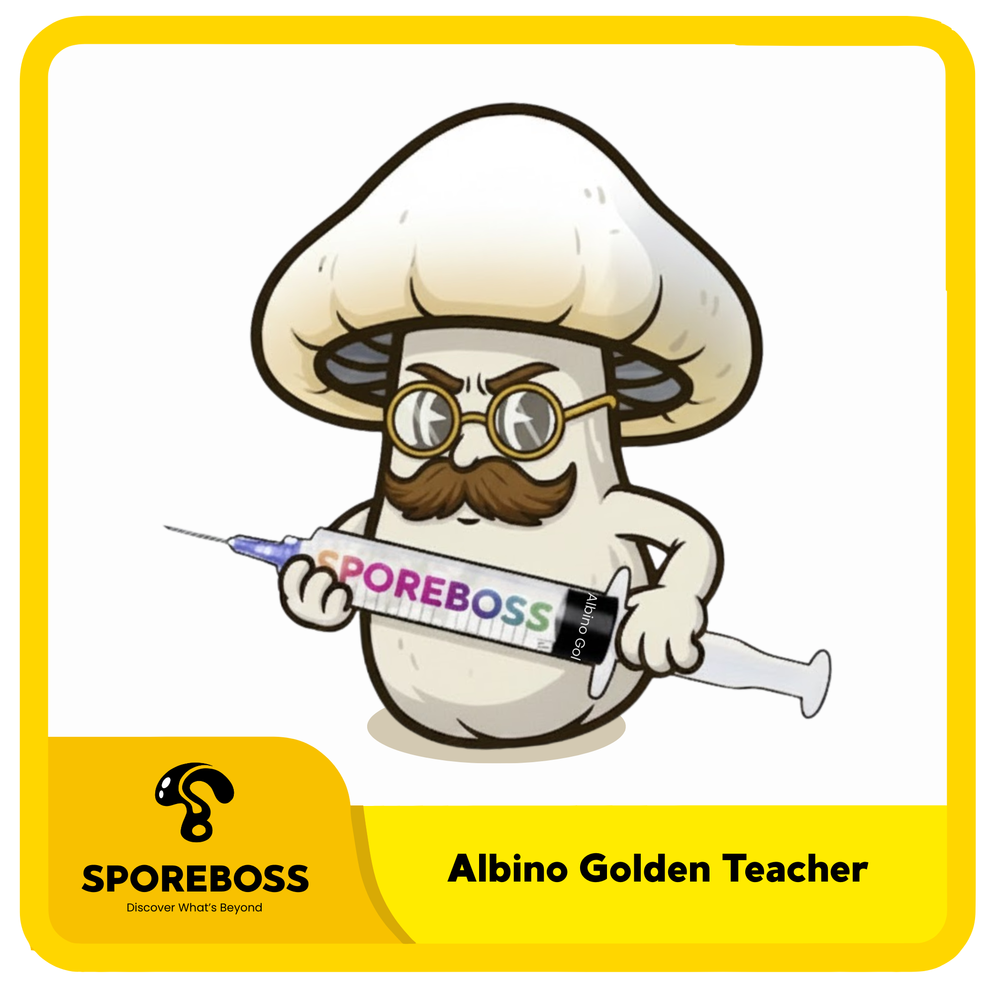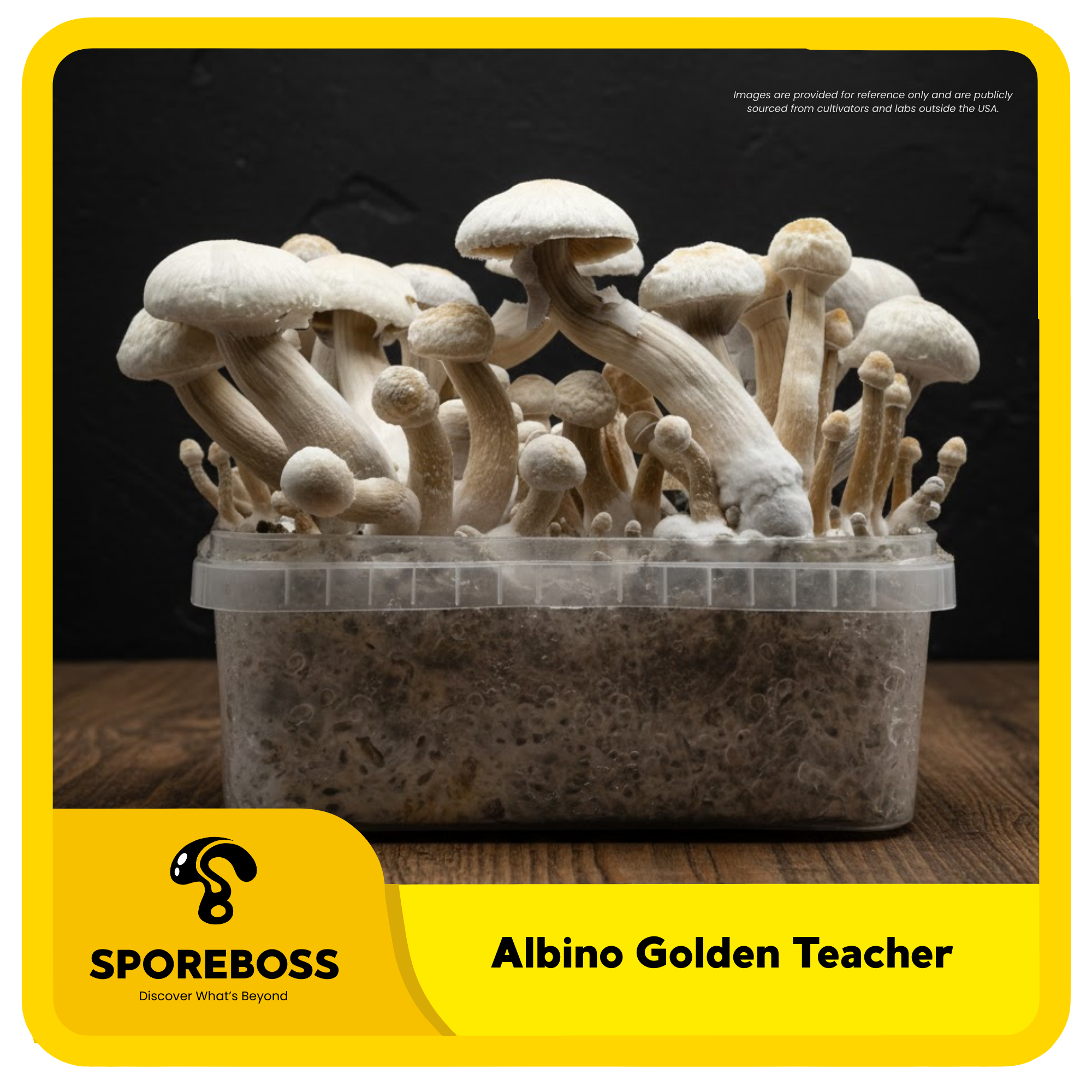 Albino GT is an albino form of Golden Teacher cubensis. Isolated from a single albino fruit in a grow of Golden Teachers. The cap and stipes are all white, and they do not drop spores. Typically slower growing than Golden Teacher, but with similar contamination resistance.
