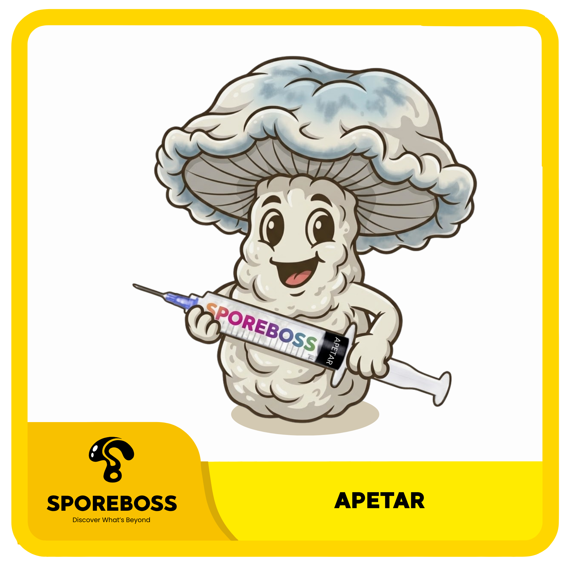Visually, APETAR tends to produce thick, sturdy stems with rounded caps in light cream to soft caramel shades. Blue bruising is often noticeable, creating strong contrast along the surface. The overall look sits nicely between traditional cubensis shapes and heavier PE-style builds, making it an excellent strain for morphological study and observation.