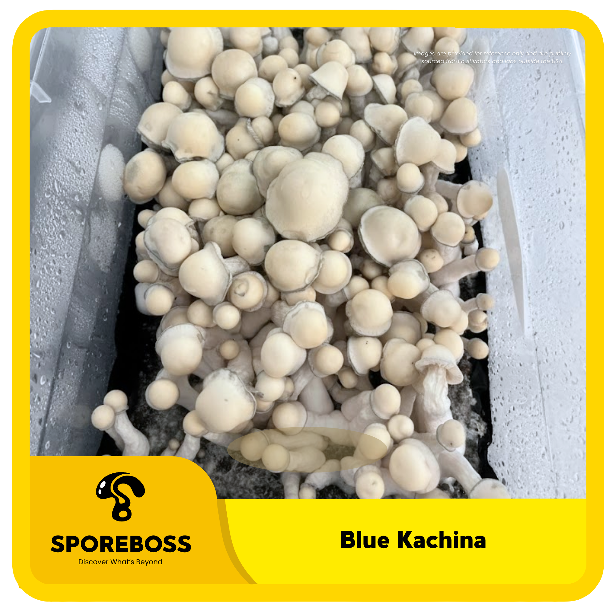 Blue Kachina is a hybrid cubensis of Makilla Gorilla x SV-10. It has thick PE shaped fruits with small caps in shades of blue and gold. The gills of Blue Kachina are wavy and densely packed together, unique for a cubensis isolation.