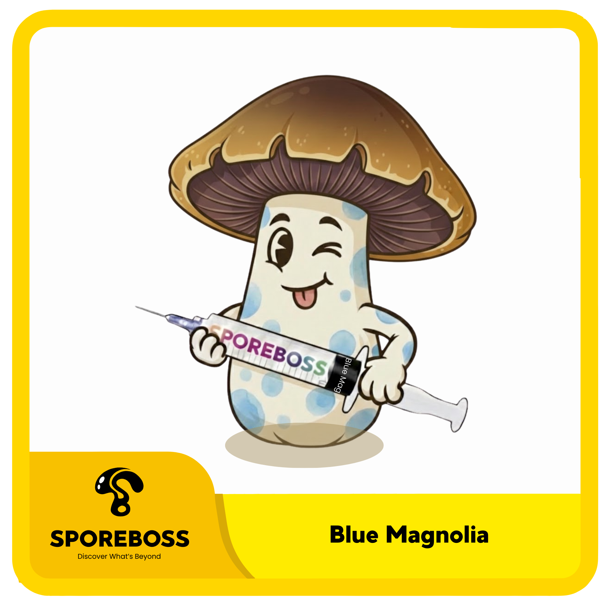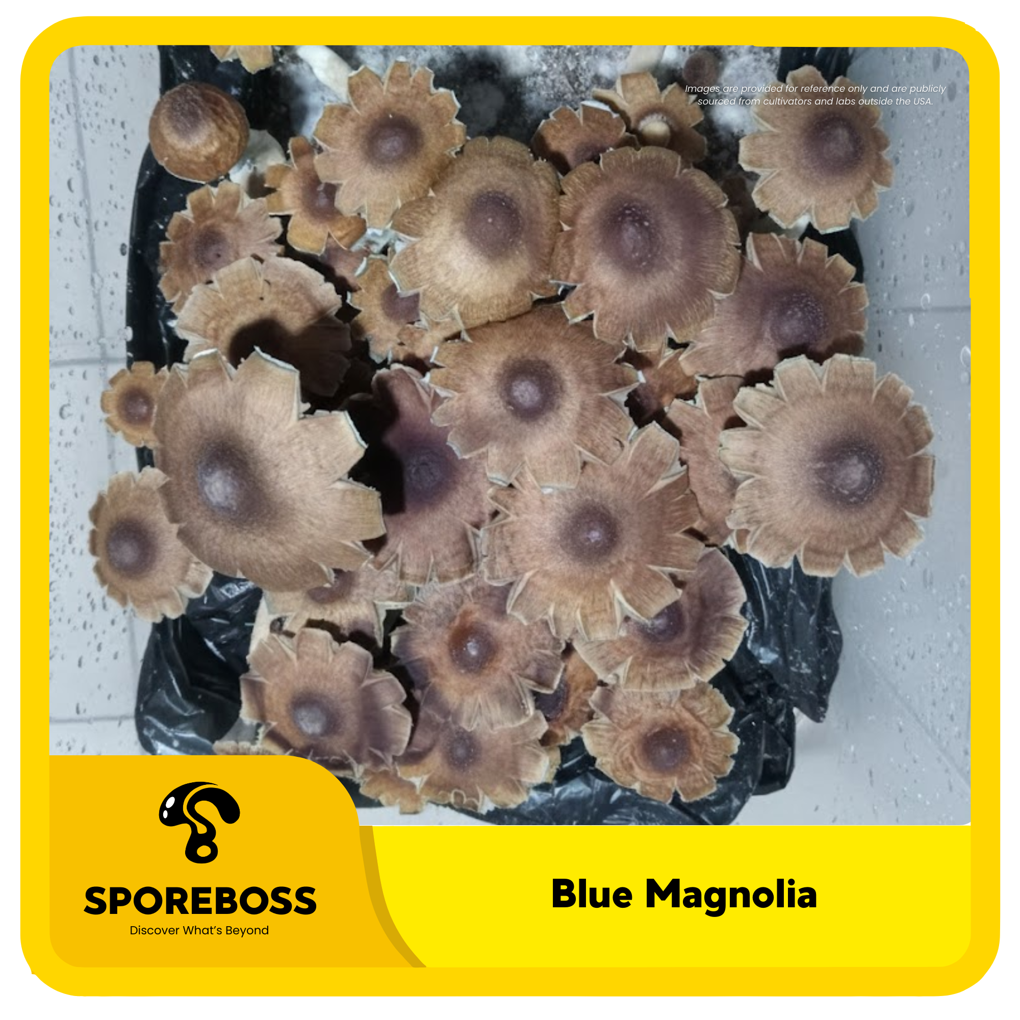 Blue Magnolia is a visually distinct lineage known for its deep, dark-toned caps and bold, striking appearance.