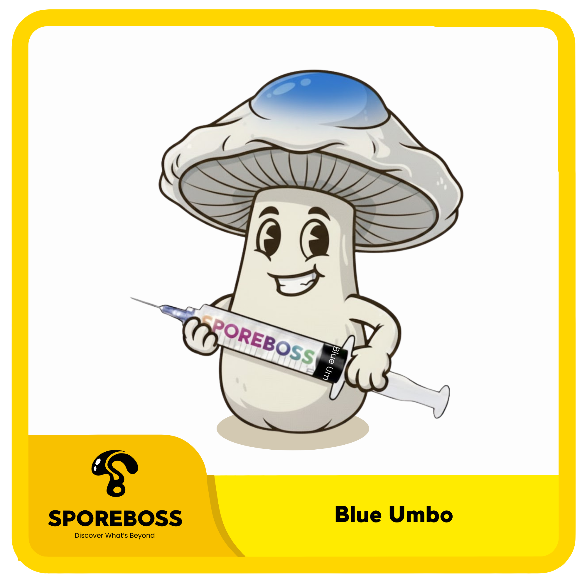 Blue Umbo is an albino isolation of Yellow Umbo (Jack Frost x P. natalensis). Isolated by Yoshi Amano. Named for it blue “nipple” tip, otherwise known as the umbo of the mushroom cap. Unlike Yellow Umbo, Blue Umbo is albino, so it ejects no spores. Sometimes a blue bullseye is visible on the top of the caps.