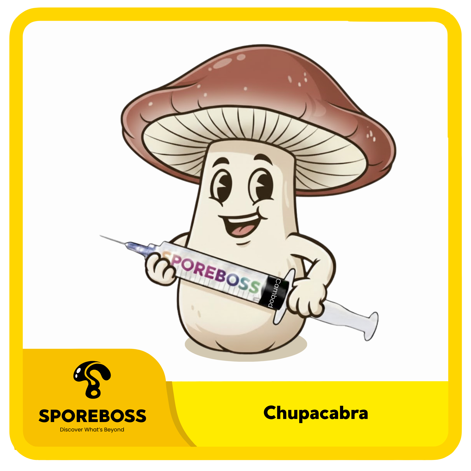Chupacabra is a Dave Wombat isolation. Isolated from wild Mexican Redspore cubensis. They have reddish brown caps with upcurled edges. They have light colored gills, and purple spores that don’t eject. The stipes are long and skinny. Chupacabra sometimes mutates, creating “brains” among the fruits.
