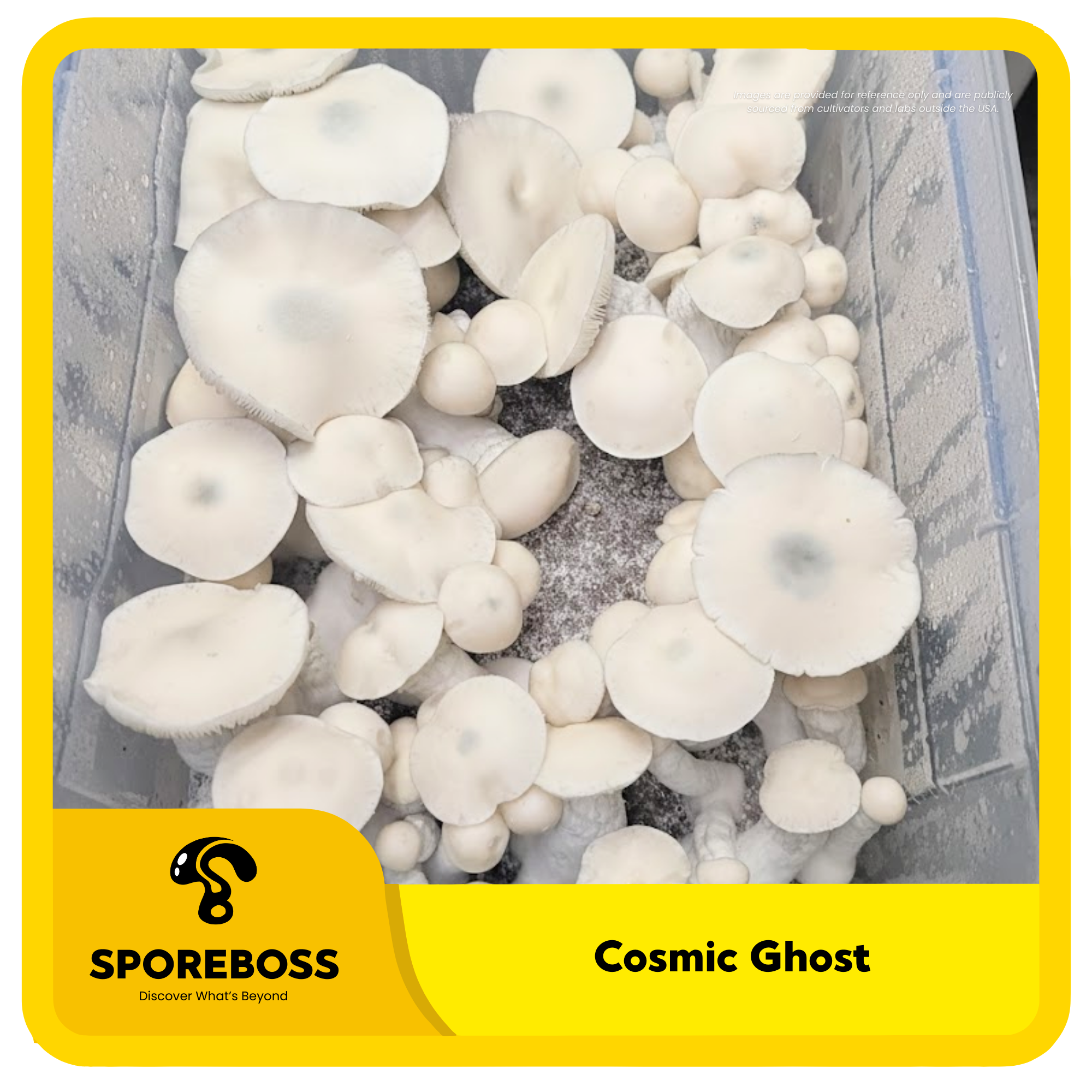 Cosmic Ghost (short for Cosmic Ghost Rider) is a cross of SV-10 (an isolation of A.P.E.) x Casper by PsyteamUnited. The caps are bell shaped and cream colored with spots of blue or black bruising. The stipes are thick and solid, with wrinkled stipe below the cap.