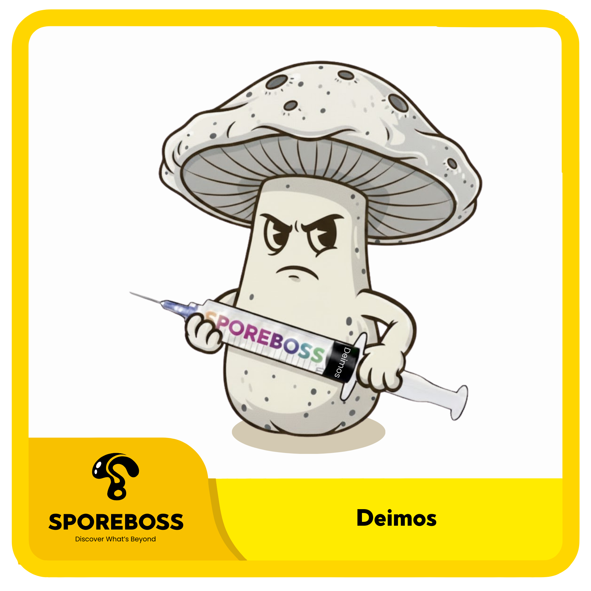 Deimos is a cubensis strain isolated by MycoCat Genetix. MycoCat first isolated Phobos, an albino isolation of Mars cubensis. Deimos is a variation of the Phobos isolation (Phobos and Deimos are the names of Mars’ moons). Deimos has grey and black pigment instead of white and blue. Deimos is a tub filler with large fruits often providing a full canopy.