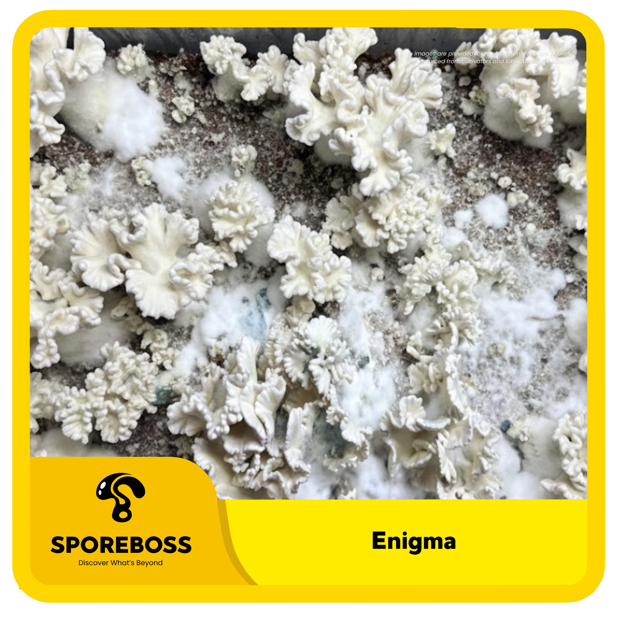 Enigma was the first isolated blob mutation. The blobs look like brains or coral reef. They start out looking like normal pins. But instead of forming caps, the pins merge together into a mass blob and continue to grow very slowly for several weeks. It doesn’t produce spores, so the only method of sharing is through cloning (tissue cultures).