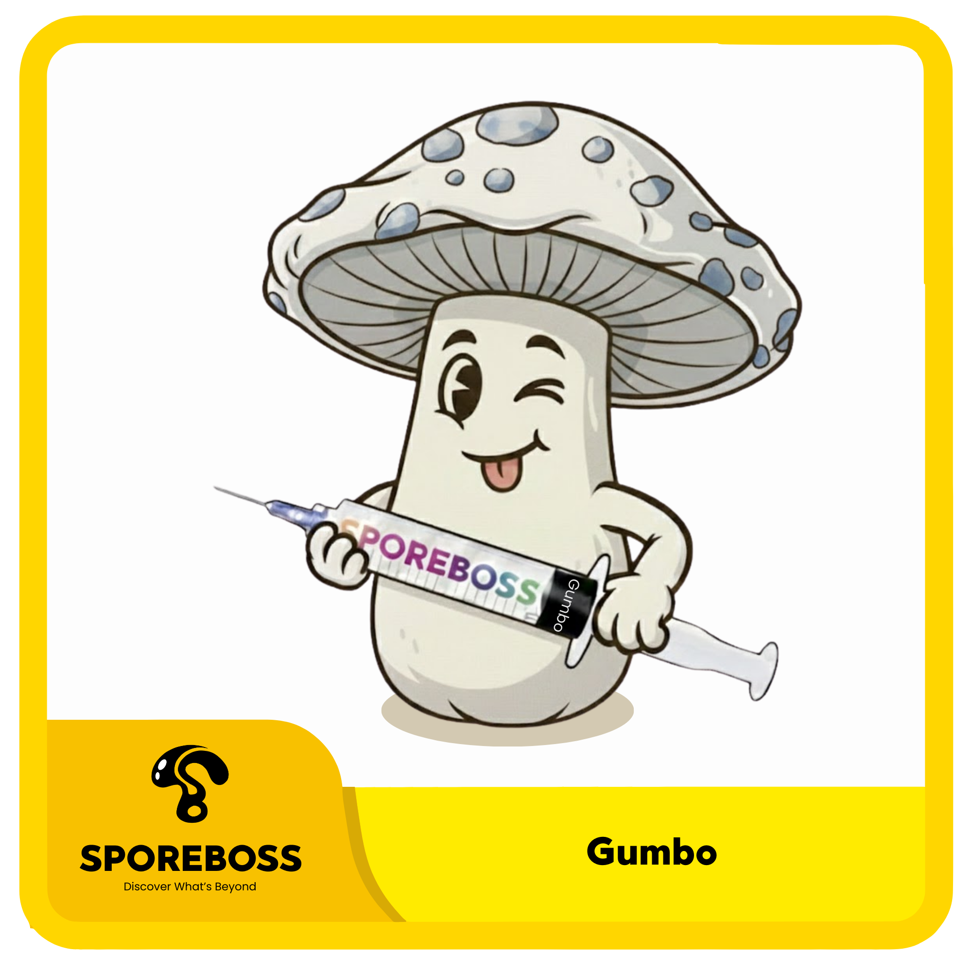 Gumbo cubensis is a hybrid of Nutcracker (a TAT isolation) and Albino A+. Little is known about the origin of these genetics. Gumbo has long white stipes with bumpy caps in shades of white, grey and blue.