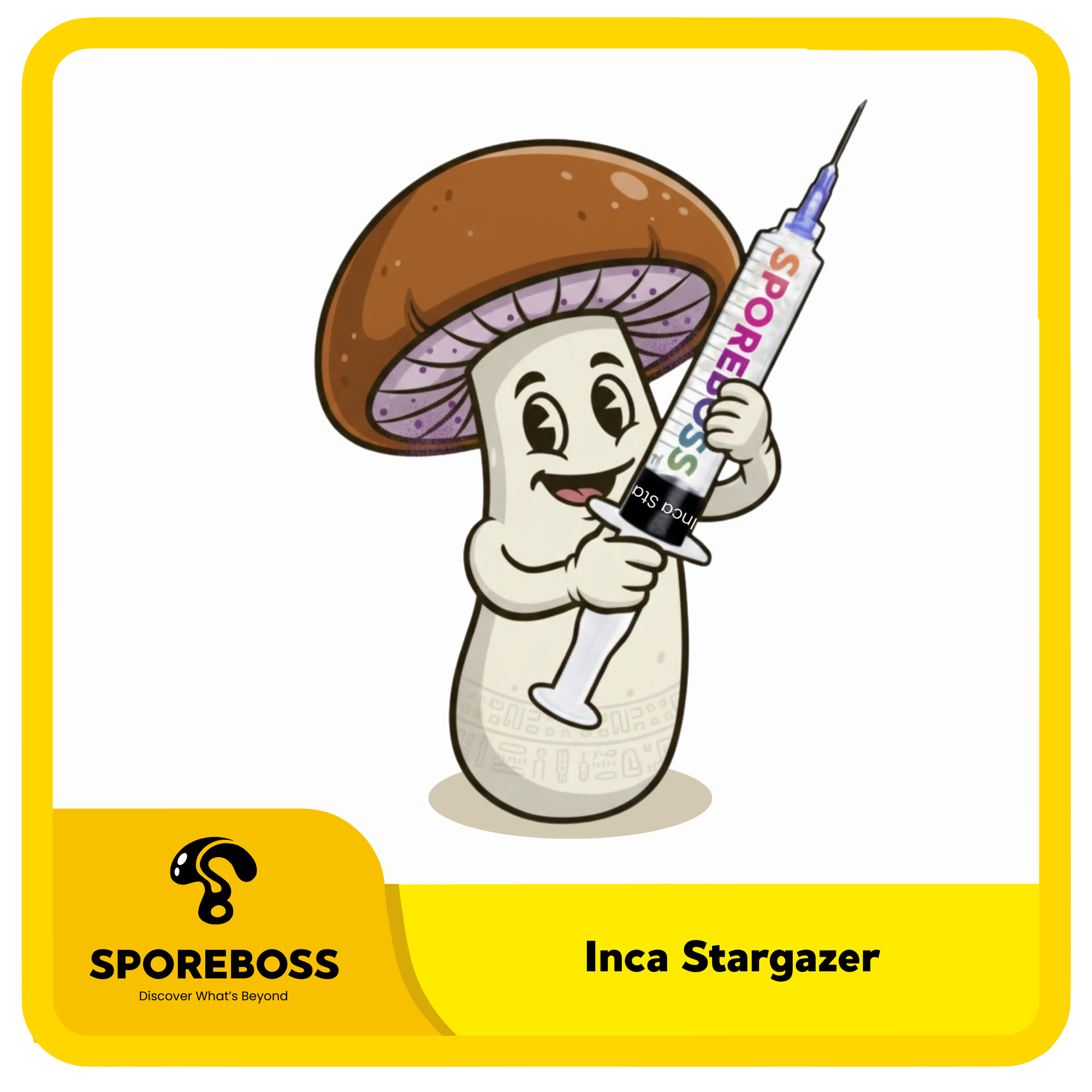 Inca Stargazer cubensis is a variety of psilocybin mushrooms that is said to have originated in the Andes mountains near the ancient Inca ruins. They have small brown caps that drop purple spores.