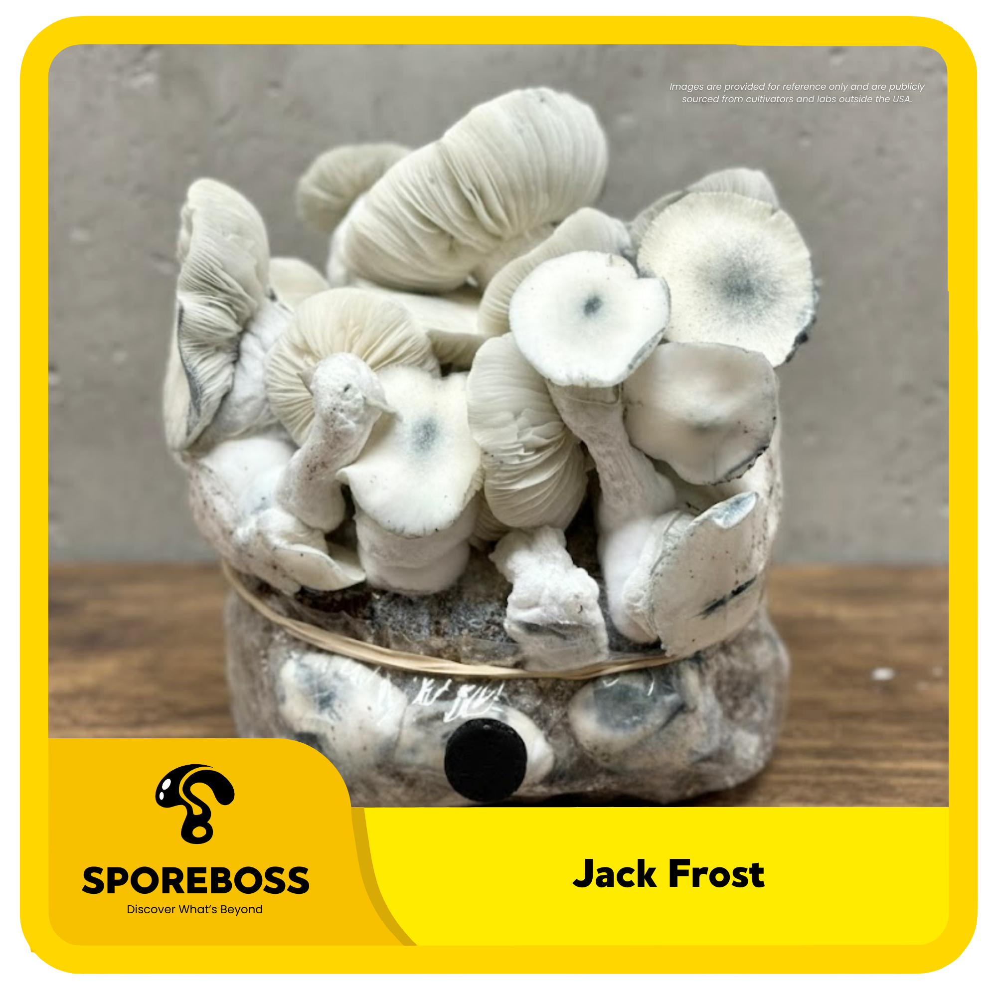 Jack Frost is the pride and joy of Wombat Labs. It is a cross of Albino PE and True Albino Teacher. The cap retains the delicate white cap of TAT, but the gills go from white, to silver, to dark blue as it’s spores mature.