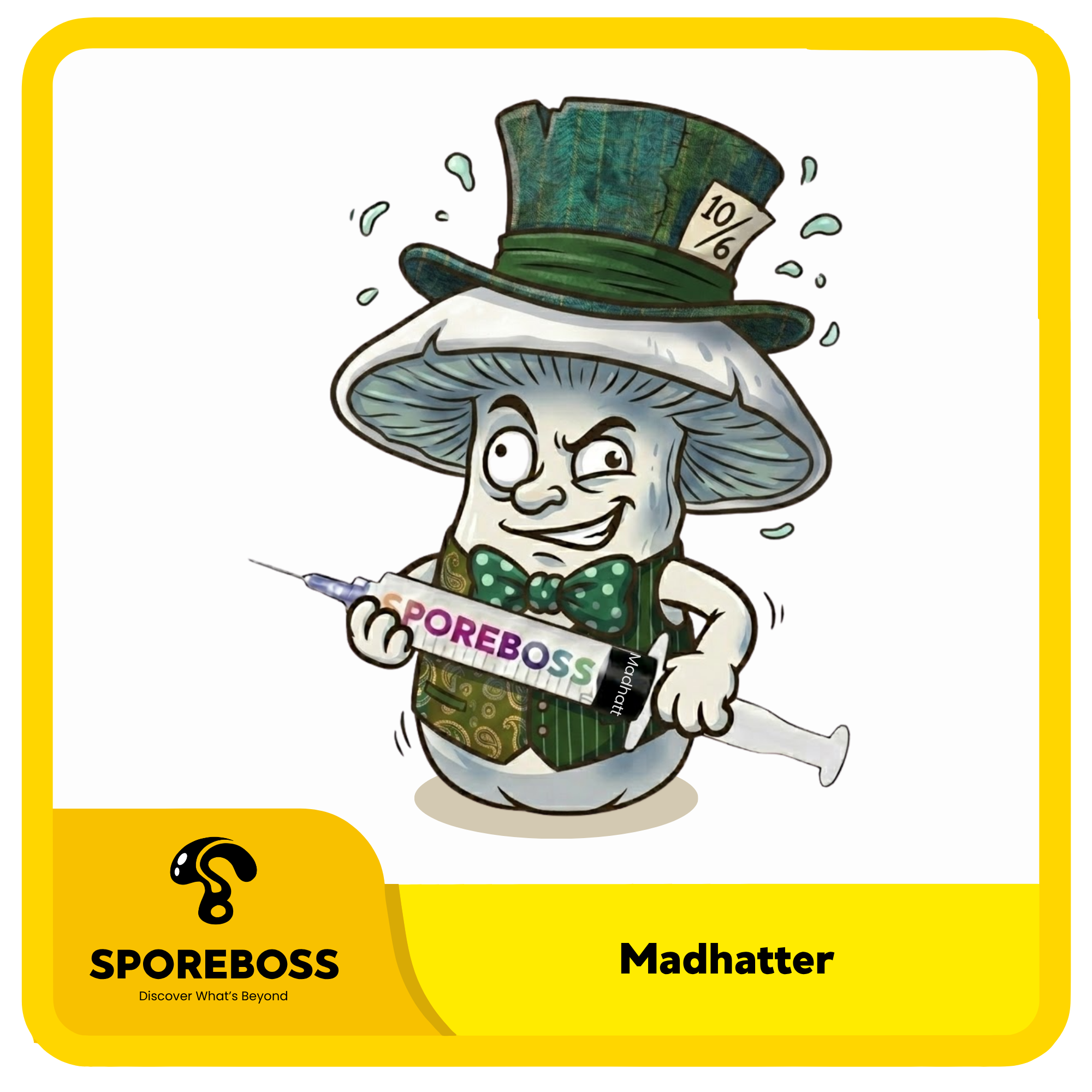 It typically produces dense clusters of smooth, white to off-white caps supported by sturdy stems, often showing subtle bruising with handling. Known for its consistent formations and balanced growth characteristics, Mad Hatter stands out as a distinctive and visually striking cubensis isolate.