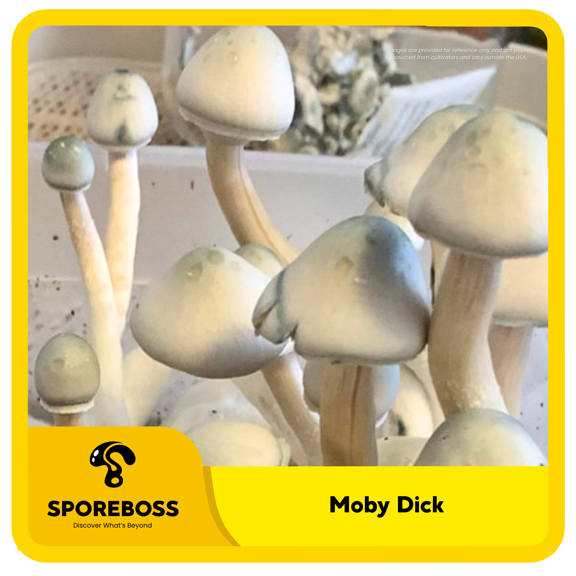 Moby Dick cubensis is a type of magic mushroom that is the result of crossing two strains: Albino A+ and Golden Teacher. It has a distinctive appearance with a lack of pigment in the caps, making it a leucistic isolation. It is popular for its strong effects and easy growth.