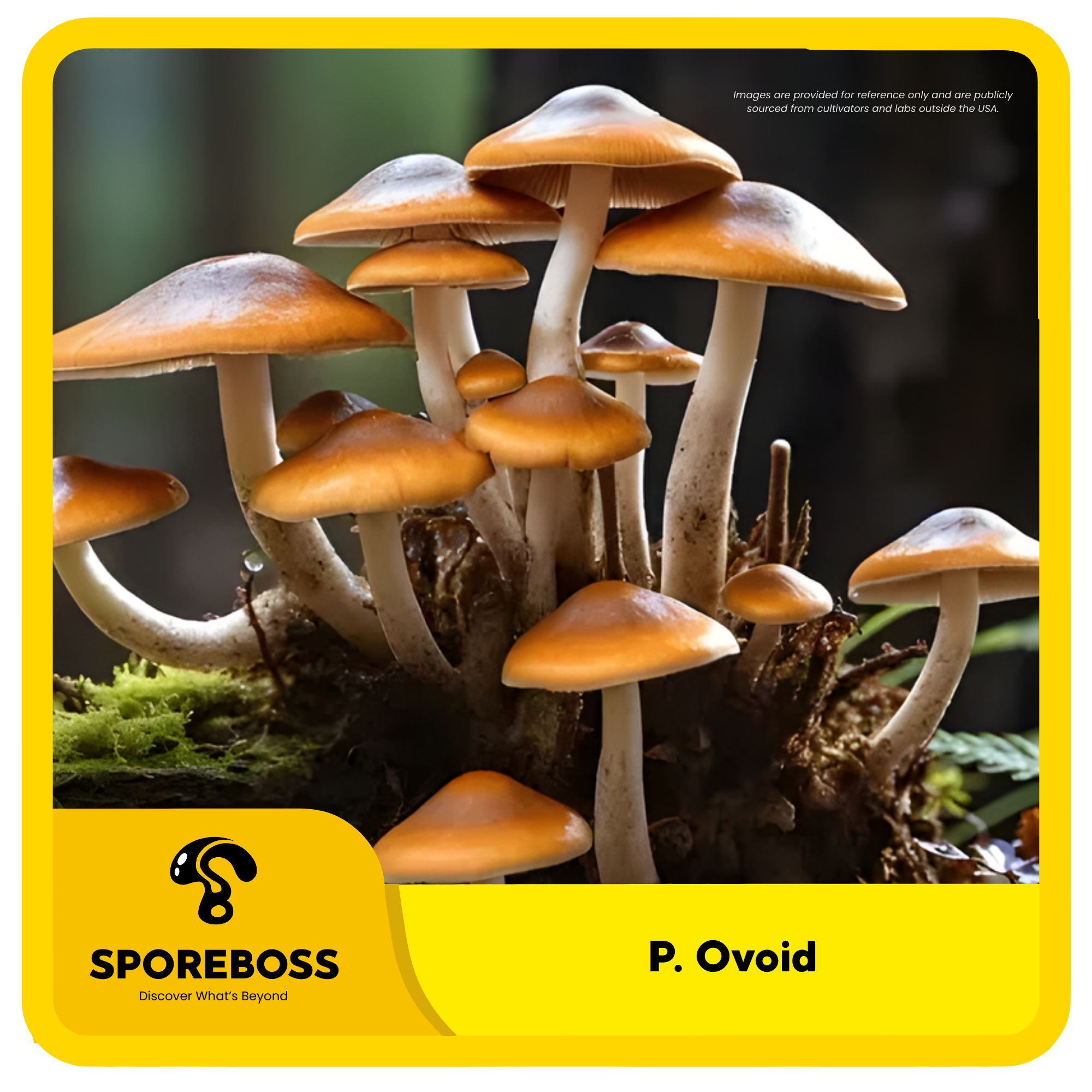 P. Ovoid (Psilocybe Ovoideocystidiata) is a newly discovered species of psilocybin mushroom. It was first documented by Richard V. Gaines in Montgomery County, PA in June 2003. The caps are tan at the center and brown at the edges. An interesting distinguishing feature of P. Ovoid is their rhomboid shape spores. They are often found along rivers and streams, usually in woody debris.