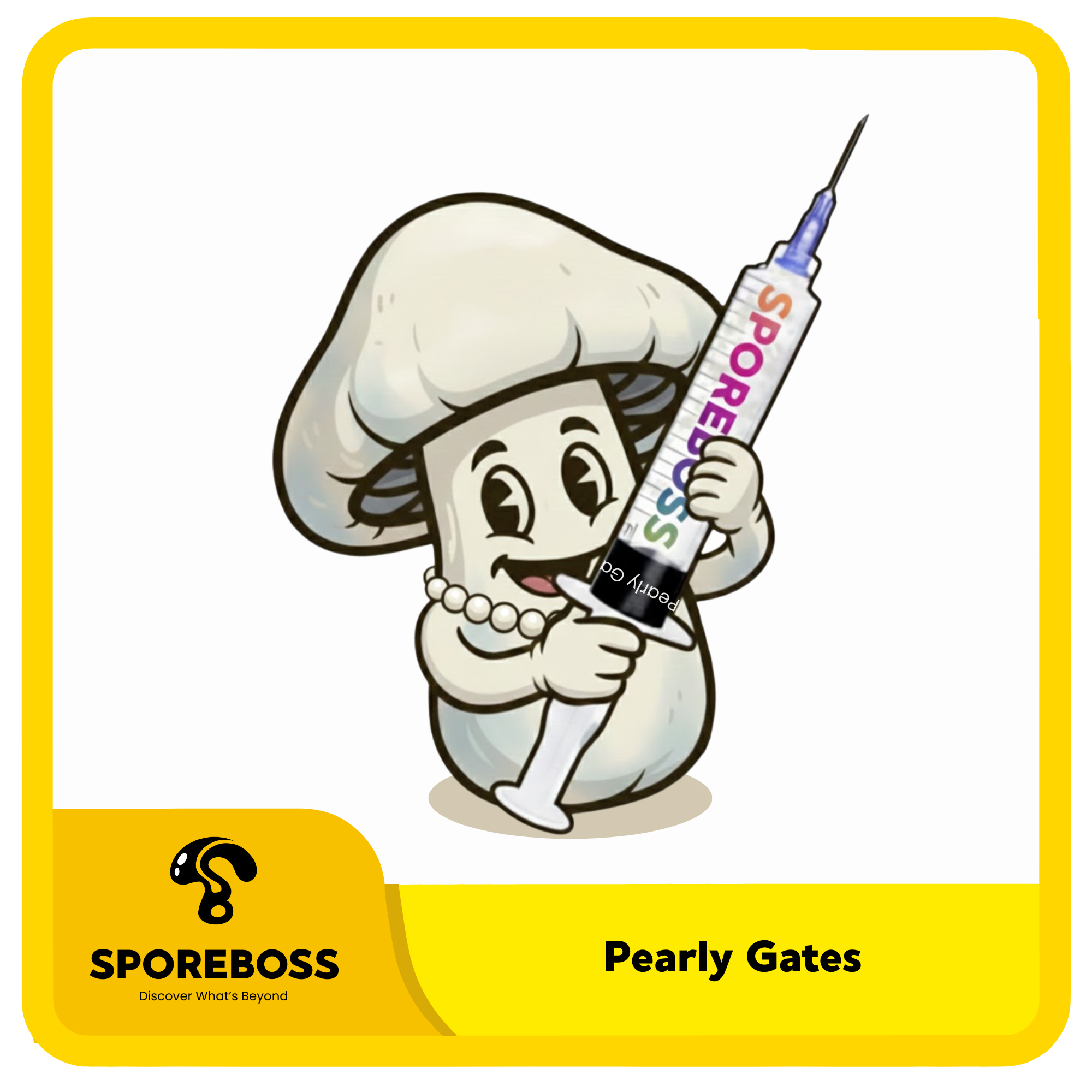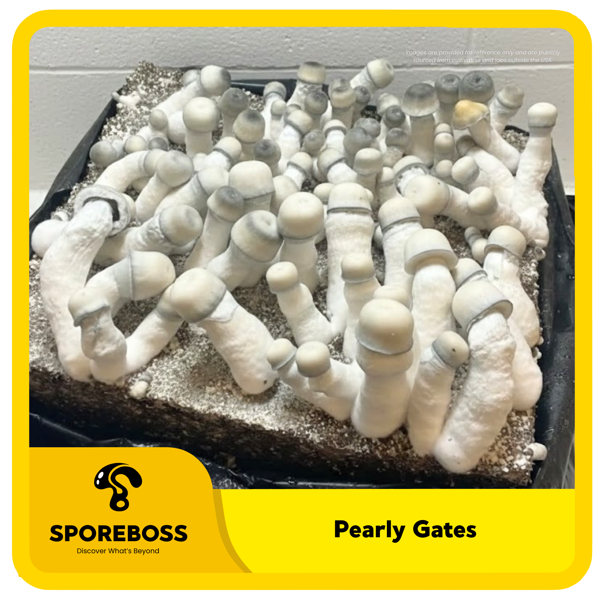 Pearly Gates cubensis is a hybrid of Melmak x True Albino Teacher. Isolated by Michael Montgomery. Pearly Gates is an albino isolation, with helmet shaped caps. The stipes are long and crinkled.