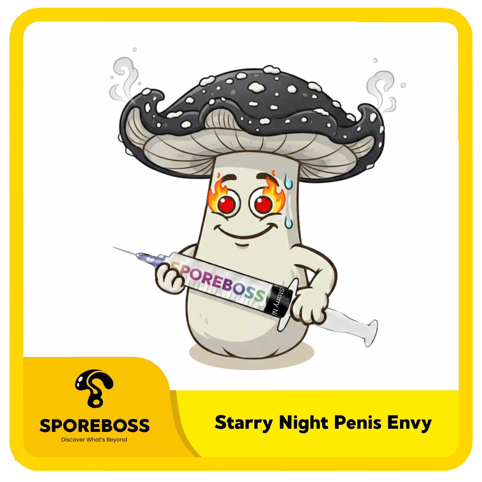 Starry Night Penis Envy is a cubensis hybrid of Penis Envy and Starry Night Albino Penis Envy. This mushroom got the good looks from S.N.A.P.E. and the beefiness of P.E. They have thick white stipes with small silver to black caps. Both parent fruits are known for high potency, which makes this a very spicy mushroom.